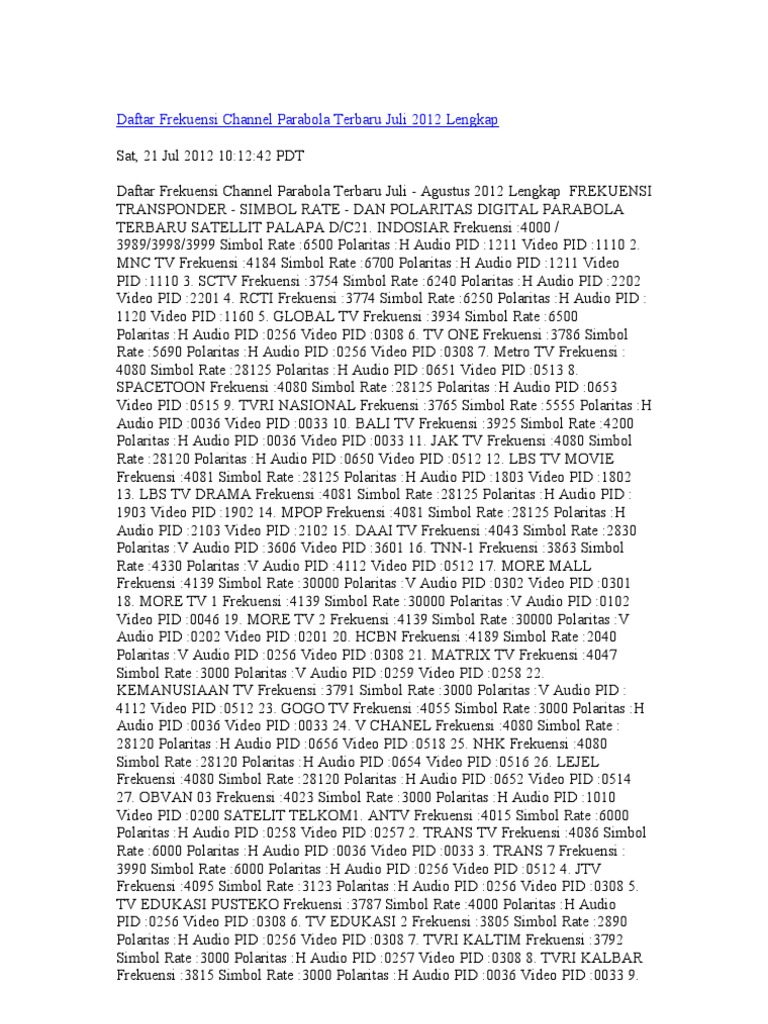 Cari infomarsi perihal cara buka saluran dewasa frekuensi film dewasa satelit palapa. Penerimaan frekuensi baru masih pada transponder lama satelit palapa d pada posisi 1130e dan channel rcti dapat diterima menggunkan receiver format mpeg2 dan mpeg4. Update daftar kode freq transponder satelit palapa d at 11300e hanya channel fta bisa di terima dengan receiver parabola dvb s mpeg2 fta dan receiver dvb s2 mpeg 4 hd hanya bisa di terima dengan receiver parabola dvb s2 mpeg 4 hd freq polarity sym rate nama channel video pid audio pid pcr pid 4080 h.